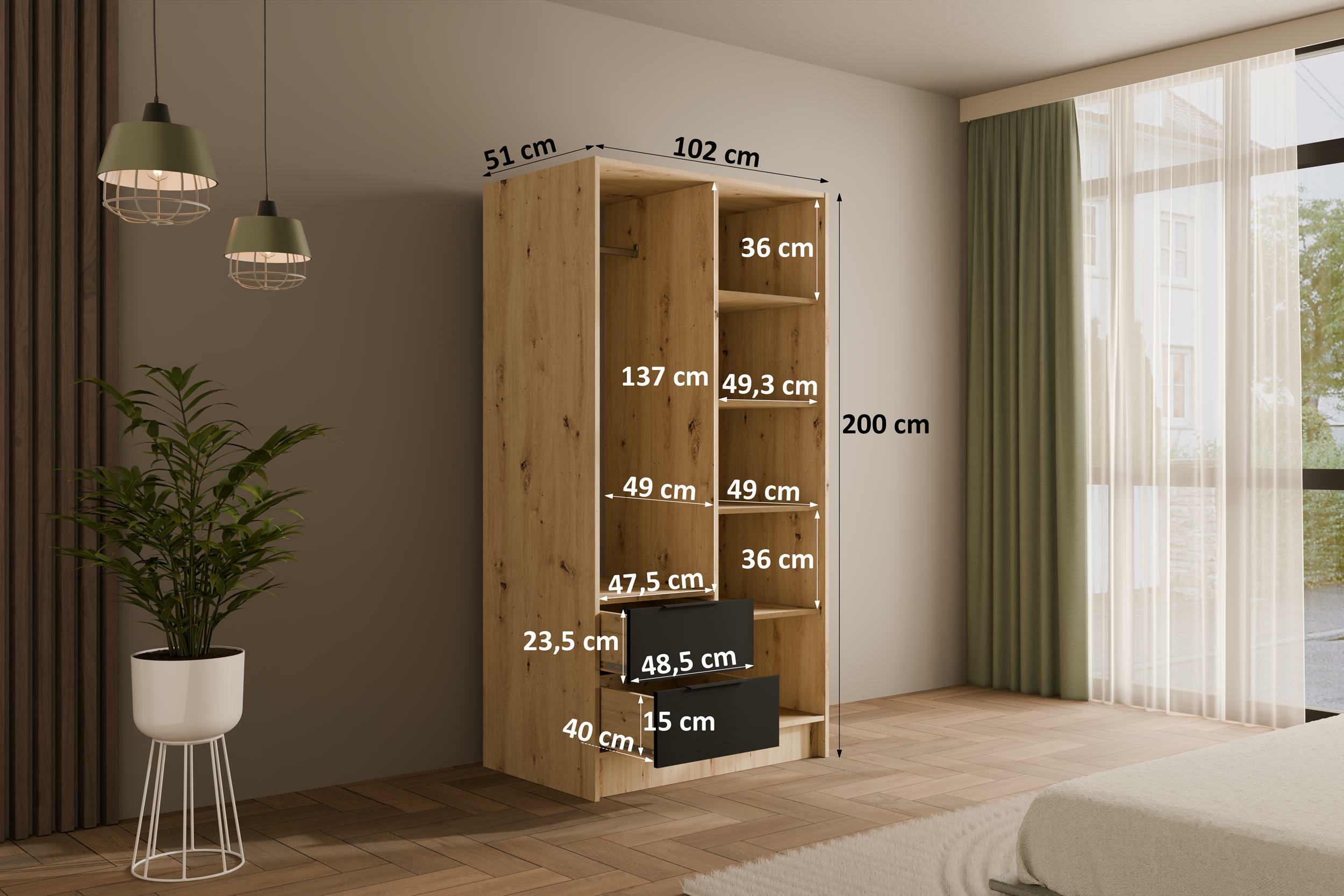 Eiche Artisan + Schwarz + Eiche Artisan 102 cm x 51 cm x 200 cm