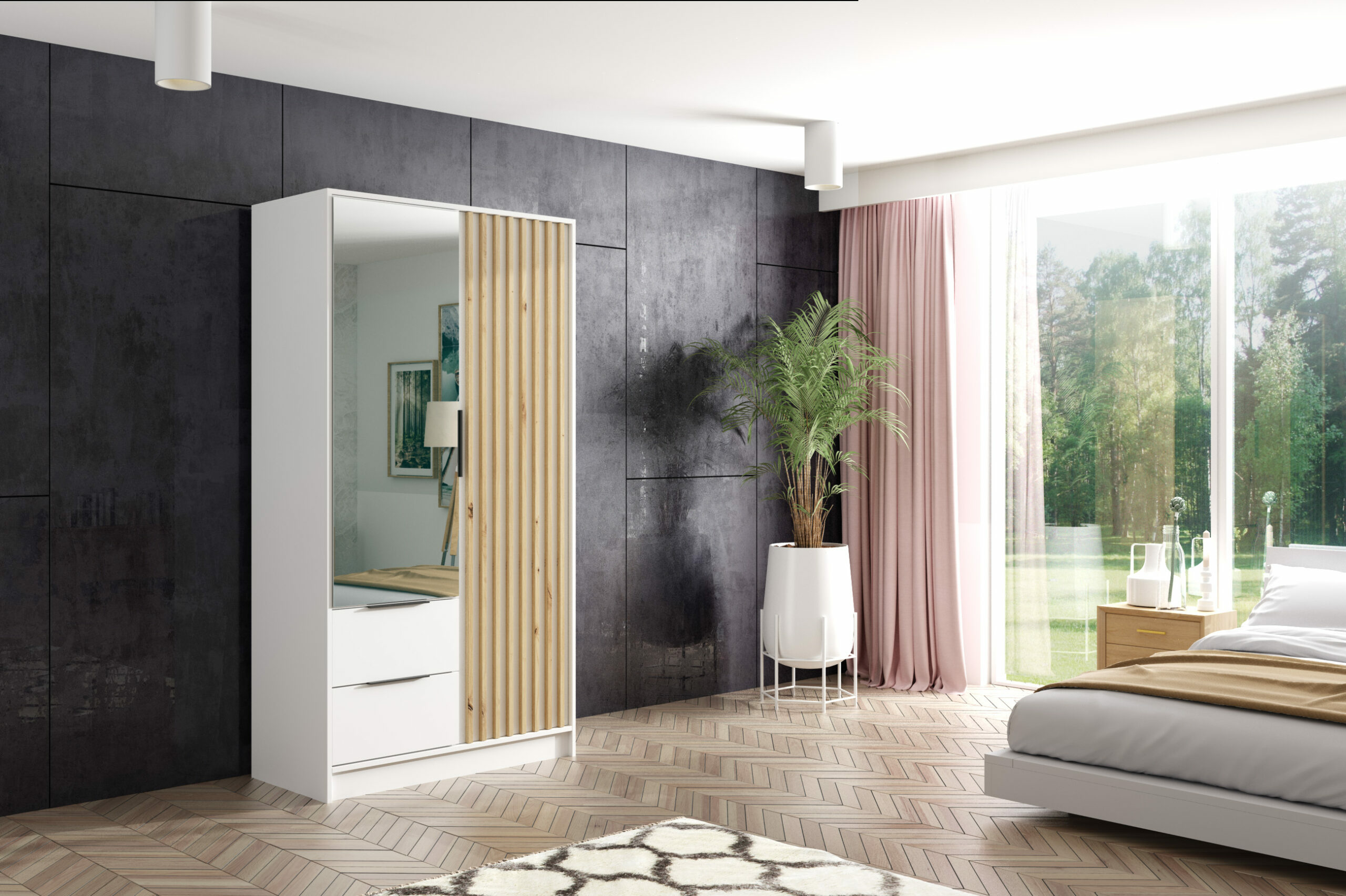 Drehtürenschränke NERA Weiß + Weiß + Eiche Artisan 102 cm x 51 cm x 200 cm