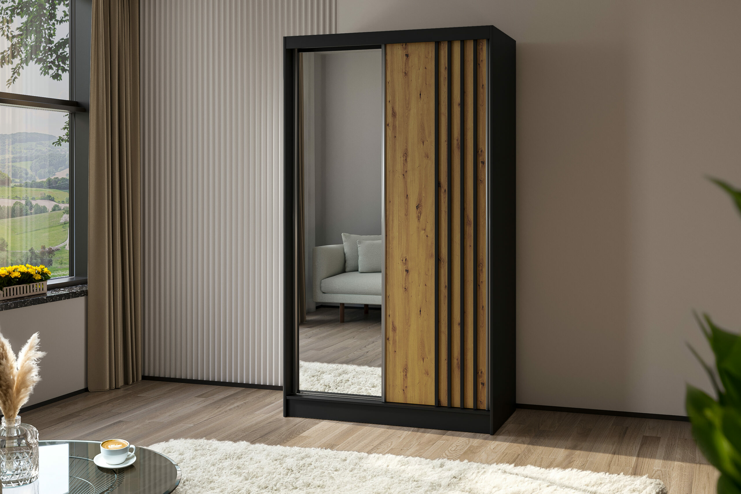 Schiebetürenschränke NALLA Schwarz + Artisan + Schwarz 120 cm x 61 cm x 216 cm
